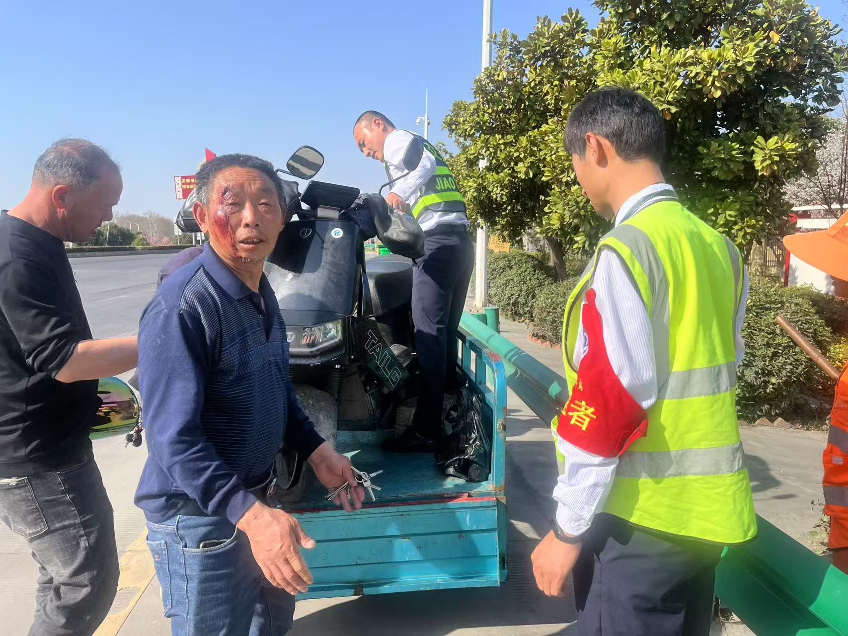 3月25日下午,收费站北广场非机动车道出口处,一辆电动车突然失控侧翻,驾驶员头部受伤倒地,面部血流不止,“红色驿站”志愿者发现后立即将伤者送往就近医院处理伤口,并协助驾驶员将损毁的电动车进行处置。