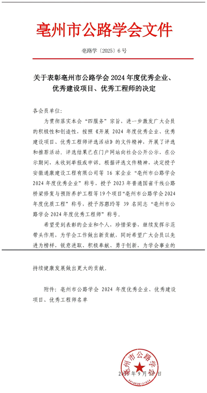 亳州市公路学会2024年度优秀企业