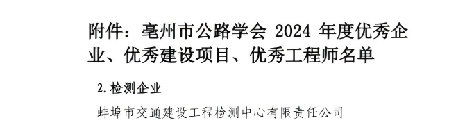 近日,亳州市公路学会公布2024年度评优名单,交通检测中心凭借过硬技术实力、出色项目管理能力及高度行业责任感,一举斩获“优秀企业”“优秀建设项目”及“优秀工程师”多项荣誉。