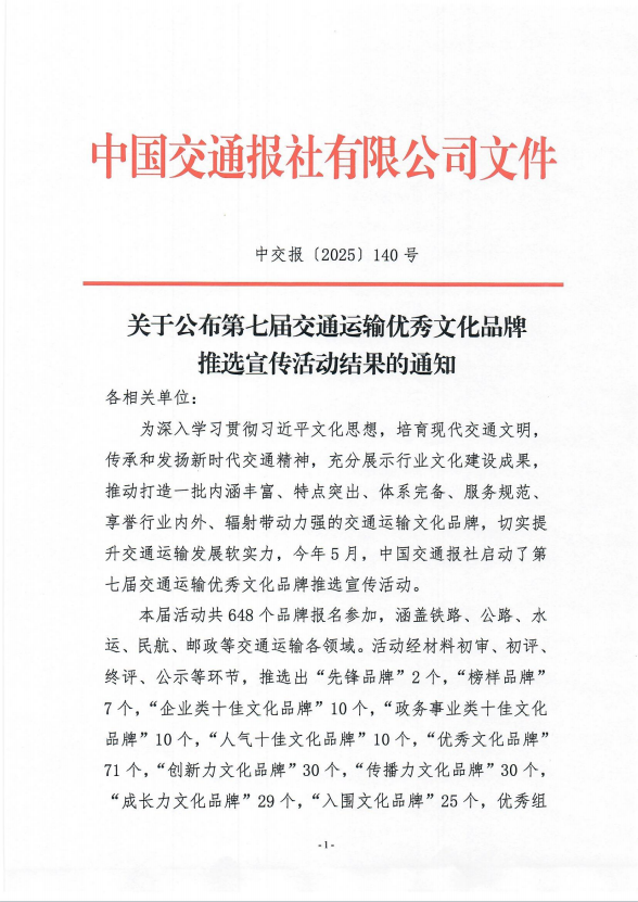 本届推选活动吸引了铁路、公路、民航、水运、邮政等交通运输各领域648个优质品牌同台竞技。活动历经材料初审、初评、集赞、终评、公示等多轮严苛选拔,评审既关注品牌文化的独特性与传播力,更注重理念与实际服务的深度融合,最终推选出各类奖项。此次双品牌获奖,是行业对集团品牌建设成果的高度认可。
