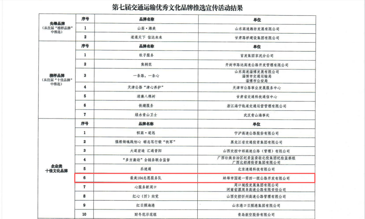 12月8日,由中国交通报社主办的“交通强国 品牌力量”第七届交通运输优秀文化品牌推选活动圆满落幕。市交控集团双品牌齐发力,在全国交通运输行业品牌舞台上绽放光彩:“最美104志愿服务队”凭借深厚积淀与亮眼实践,成功斩获“十佳文化品牌”桂冠;“平安微笑蚌固路”首次参评即脱颖而出,获评“优秀文化品牌”。