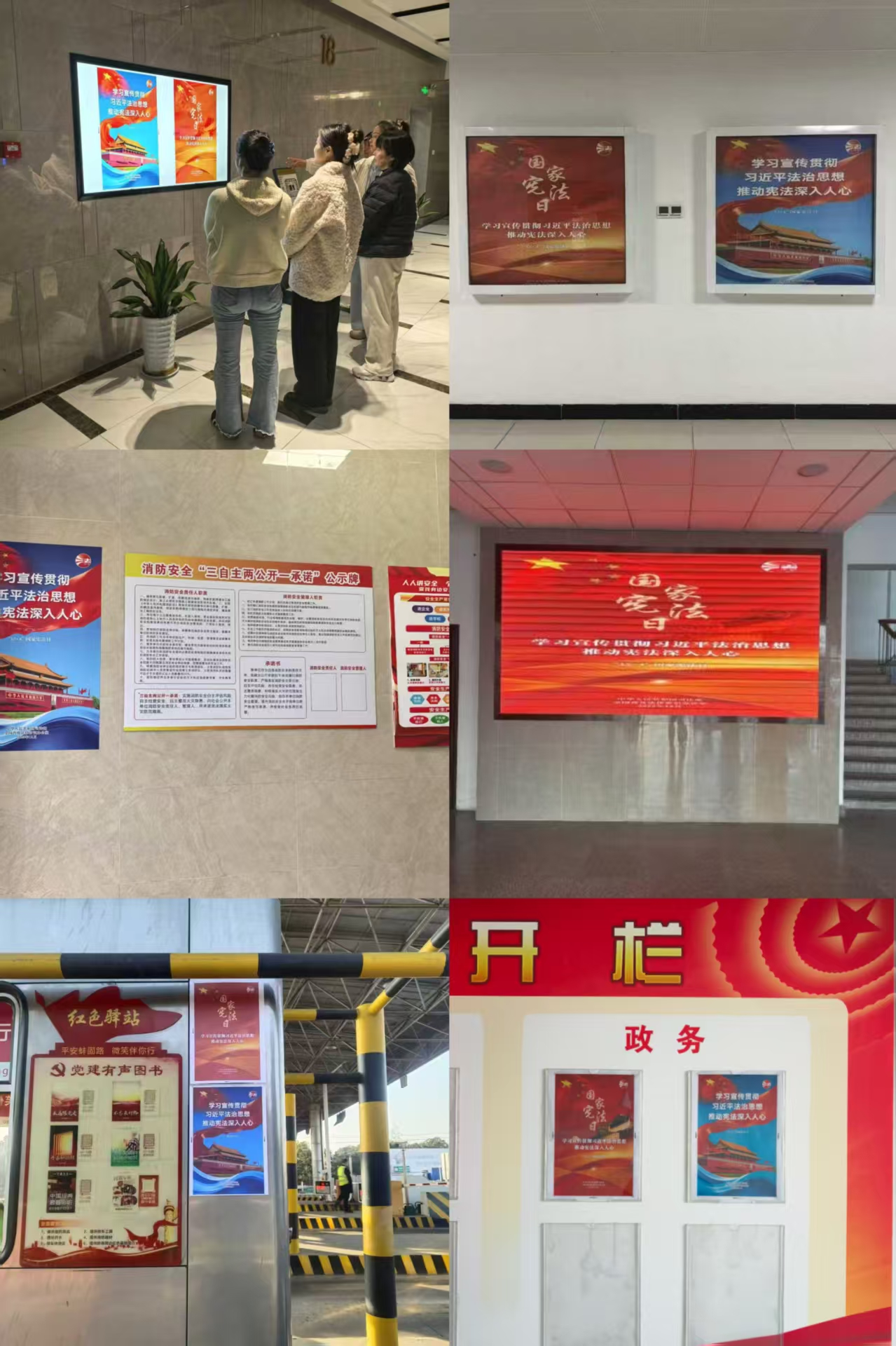 各单位积极拓展宣传阵地,创新宣传方式,推动宪法学习“活”起来、“热”起来。在12月4日第十个“国家宪法日”当天,集团本部及所属各单位充分利用办公区域走廊LED屏、政务公开栏、宣传展板、高速收费站窗口等载体,滚动播放、张贴宪法宣传标语与核心要义,将法治元素融入日常工作和公共空间,让宪法精神抬眼可见、驻足即学。