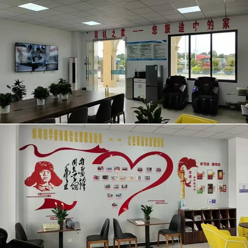 “司机之家”作为蚌固路公司“红色驿站”品牌服务窗口之一,坐落在S101新马桥两侧服务区内。在装修设计时,重点突出“家”的概念,仿效“家庭式”配置规格,配备了空调、电视机、微波炉、饮水机、电冰箱、多功能按摩椅、有声图书馆、宣传报刊、无线网络等设施。在装修设计上,设置了相对独立、私密性较好的休息“小包间”;在人员接待上,采用进场登记、预约叫醒;在安全管控上,采用24小时视频监控,并专门安排服务人员负责车辆停放管理;在洗漱服务上,配置24小时淋浴热水器、洗衣烘干一体机等,一系列贴心的服务让司机能够“吃口热饭、喝口热水、洗个热水澡、睡个安心觉、停个放心车”。此外,服务区内还提供加油、充电、车辆维修和保养咨询等服务。