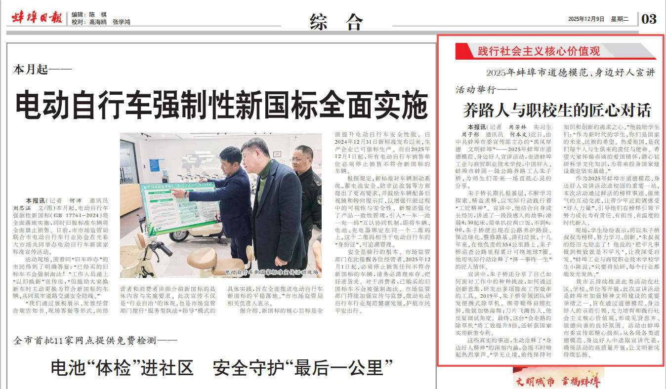 近日,由市委宣传部主办的“禹风厚德 文明蚌埠”2025年蚌埠市道德模范、身边好人宣讲活动引发广泛关注,中国好人、省劳动模范朱子桥走进蚌埠工业与商贸职业技术学校开展主题宣讲的先进事迹,被《蚌埠日报》宣传报道,其扎根一线的坚守与精益求精的匠心,成为激励广大师生与行业同仁的精神标杆。