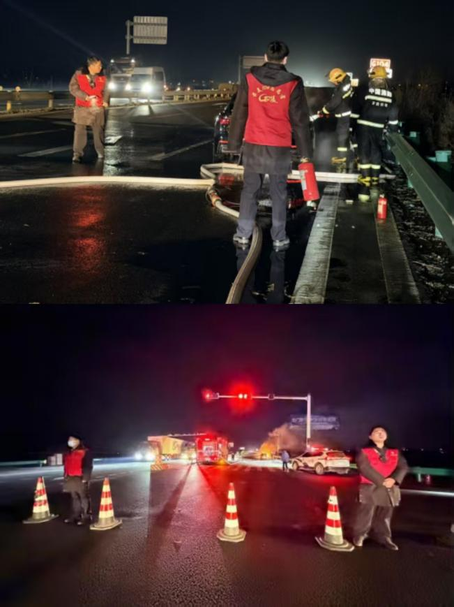 此外,当天在淮河大桥收费站附近,一辆小轿车突然起火。志愿者们立即分头行动,一部分控制火势,一部分进行交通疏导,为消防救援争取了宝贵时间。道路恢复畅通后,志愿者们又回到岗位,继续为过往司乘提供服务。