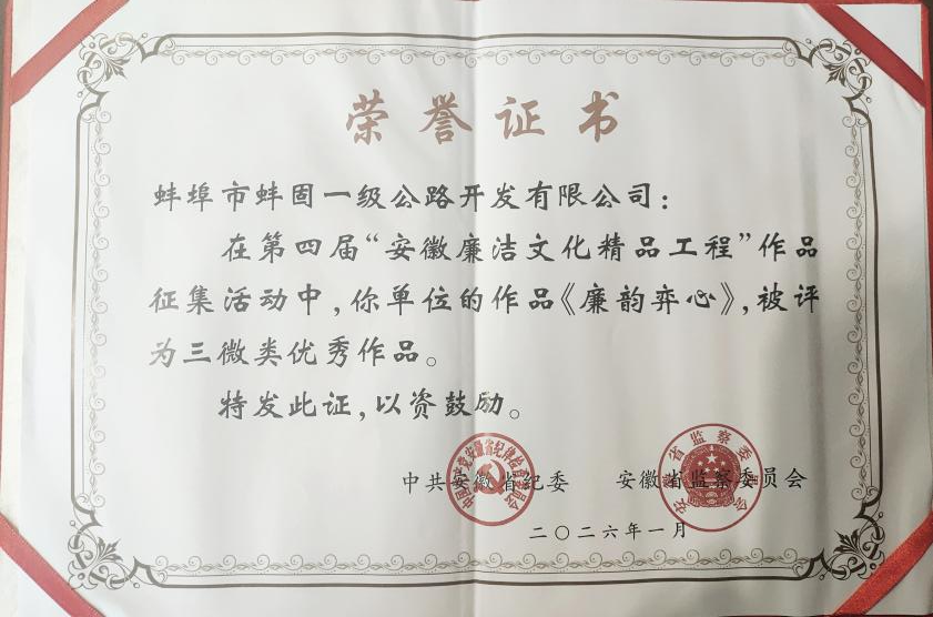 近日,从安徽省纪委监委传来喜讯,在第四届“安徽廉洁文化精品工程”作品征集评选中,由市国控集团报送、市交控集团选送、蚌固路公司创作的廉洁文化作品《廉韵弈心》,成功获评三微类优秀作品。该奖项是全省廉洁文化领域最高层级官方奖项,此次获奖不仅充分展现了集团在党风廉政建设与廉洁文化宣传领域的积极作为和扎实成效,也充分体现了基层单位深厚的文化创作潜力与活力。