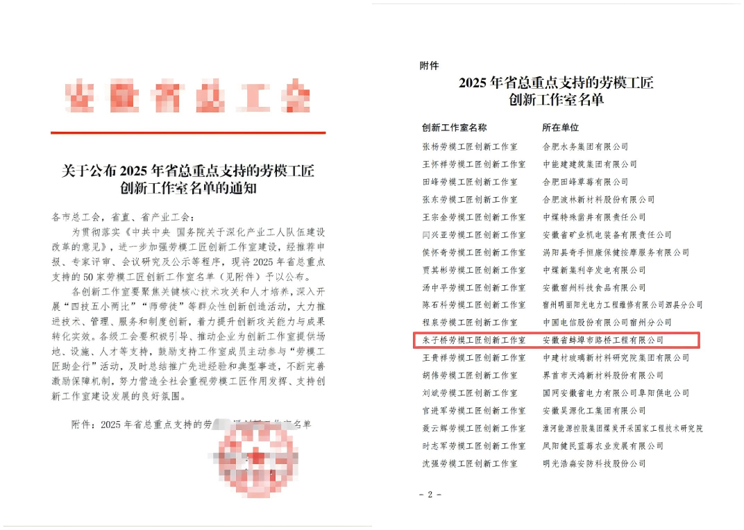 近日,安徽省总工会公布2025年省总重点支持的劳模工匠创新工作室名单,朱子桥劳模工匠创新工作室成功入选。此次评选经层层推荐、专家评审与公示程序,全省共50家工作室获得重点支持,该荣誉是对工作室持续创新、服务发展成效的充分肯定。