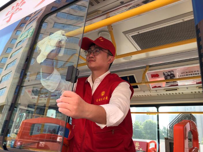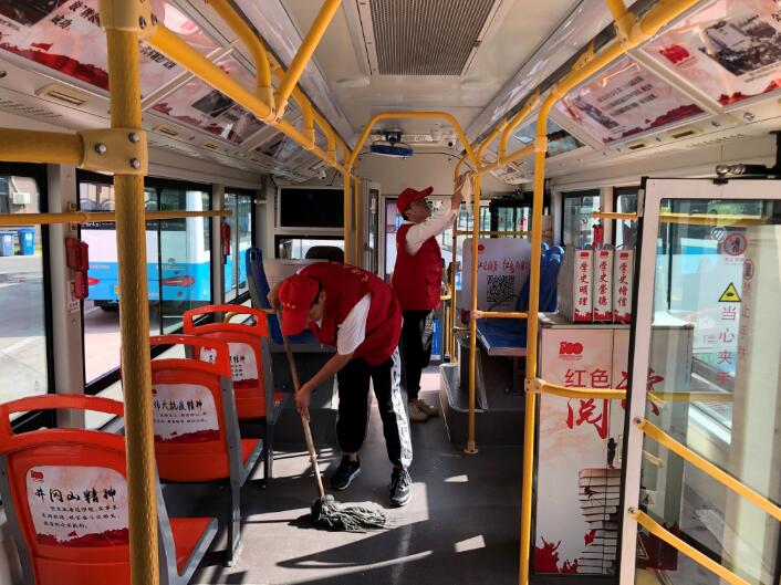 一大早,志愿者们便来到71路停靠的航华苑首末站一起动手给车辆进行彻底打扫。每台车回来后,都会停在指定位置,大家帮忙擦玻璃、拖地面、给车辆扶手擦拭消毒,忙的不亦乐乎,确保每台车都漂漂亮亮的。