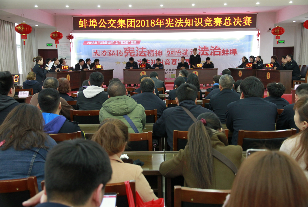 为做好《宪法修正案》的学习宣传工作,进一步加深广大员工的宪法意识, 11月7日,公交集团以“大力弘扬宪法精神,加快建设法治蚌埠”为主题的 2018年宪法知识竞赛圆满落幕。来自集团公司的14支代表队参加竞赛,经过笔试预赛,6支代表队脱颖而出,进入当天的决赛。