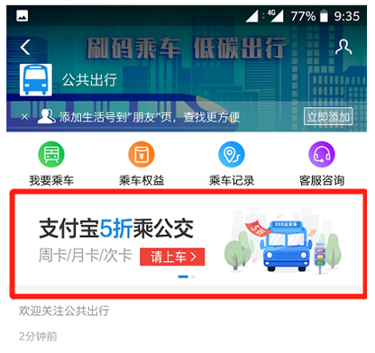 为倡导市民低碳出行,迎接即将到来的全国“公交出行宣传周”活动,公交集团与支付宝联合开展支付宝扫码优惠乘车活动。