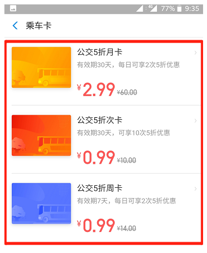 2、五折乘车卡: 9月15日-9月30日,可在支付宝APP中购买5折乘车卡,其中月卡2.99元,可享受30天每天2次5折乘车;周卡0.99元,可享受7天每天2次五折乘车;次卡0.99元,可享受10次五折乘车,每日2次,有效期30日。