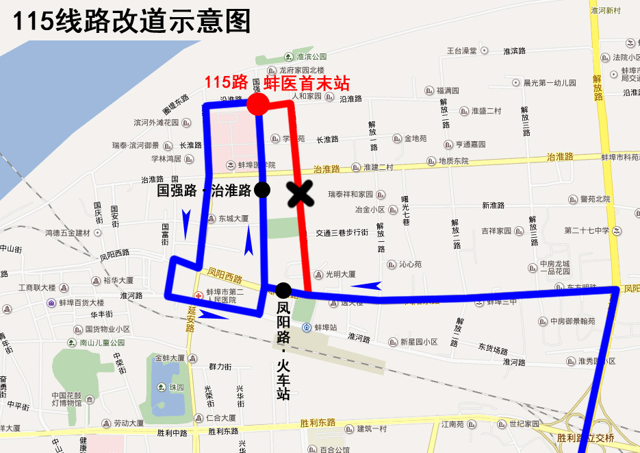115路公交车改道公告 因交通路(凤阳路至圈堤路)封闭施工,2019年4月13日起,公交115路高铁南站至蚌医首末站方向改道为:原线路—凤阳路—国强路—蚌医首末站。蚌医首末站至高铁南站方向保持不变。 改道期间公交车将取消停靠“交通路•火车站”、“交通路•光明街”、“地方海事局”站。临时停靠“凤阳路•火车站”、“国强路•治淮路”站,封闭施工结束后恢复原线。