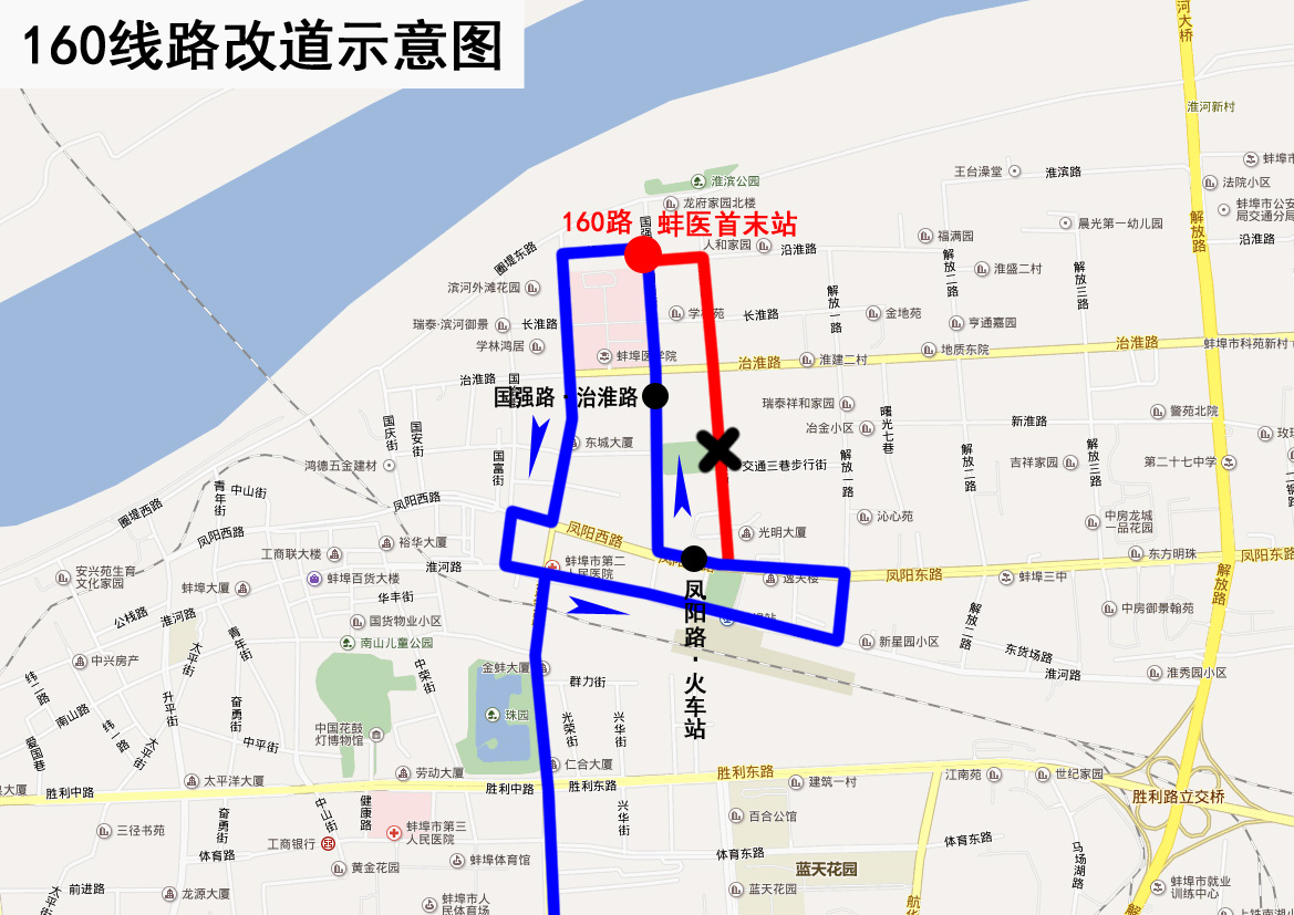 160路公交车改道公告 因交通路(凤阳路至圈堤路)封闭施工,2019年4月13日起,公交160路延安南路至蚌医首末站方向改道为:原线路—淮河路—解放一路—凤阳路—国强路—蚌医首末站。蚌医首末站至延安南路方向保持不变。 改道期间公交车将取消停靠“国强路•火车站”、“交通路•火车站”、“交通路•光明街”、“地方海事局”站。临时停靠“凤阳路•火车站”、“国强路•治淮路”站,封闭施工结束后恢复原线。