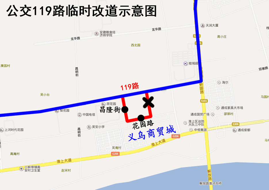 119路公交车临时改道公告 因花园路(永平街至昌平街)封闭施工,2019年4月18日起,公交119路来回双向改道为:原线路—双墩路—解放路—原线路。 改道期间公交车将取消停靠“昌隆街”、“花园路”站。封闭施工结束后恢复原线。