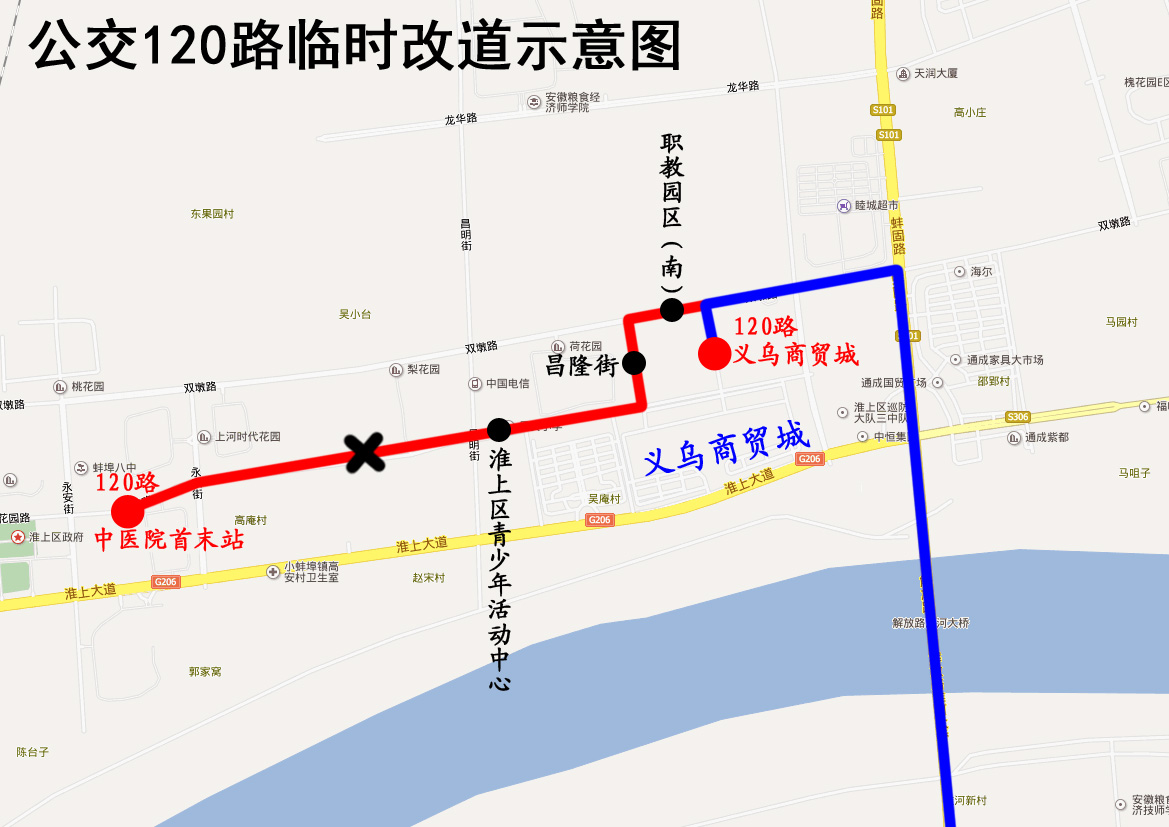 120路公交车临时改道公告 因花园路(永平街至昌平街)封闭施工,2019年4月18日起,公交120路由原中医院首末站调整至义乌商贸城首末站。 改道期间公交车将取消停靠“中医院首末站”、“淮上区青少年活动中心”、“昌隆街”、“职教园区(南)”站。封闭施工结束后恢复原线。