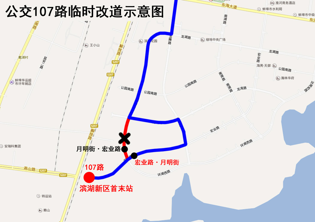 107路公交车临时改道公告 因月明街(兴民路至宏业路)封闭施工,2019年4月17日起,公交107路来回双向改道为:原线路—月明街—兴民路—龙腾路—宏业路—滨湖新区首末站。 改道期间公交车将取消停靠“月明街•宏业路”站。临时停靠“宏业路•月明街”站,封闭施工结束后恢复原线。