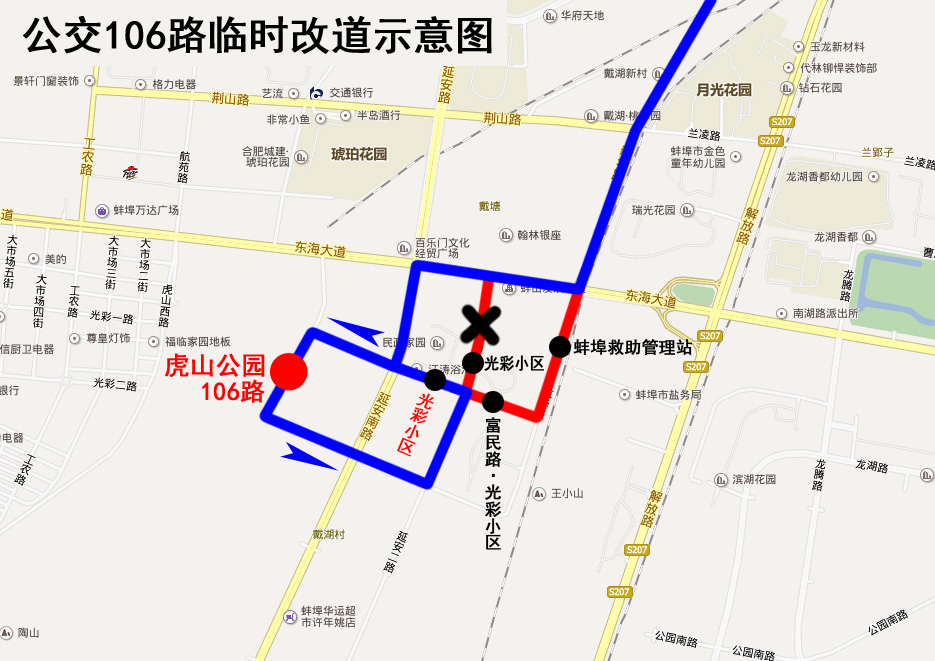 106路公交车临时改道公告 因航华路(东海大道至康民路);富华路(东海大道至富民路)封闭施工,2019年4月17日起,公交106路改道为:原线路—航华路—东海大道—延安路—富民西路—虎山公园首末站—康民路—富华路—富民路—延安路—原线路。 改道期间公交车将取消停靠“蚌埠救助管理站”、“富民路•光彩小区(富华路东侧站)”、“富华路•光彩小区”站。临时停靠“富民路•光彩小区(富华路西侧站与125路并站)”站,封闭施工结束后恢复原线。