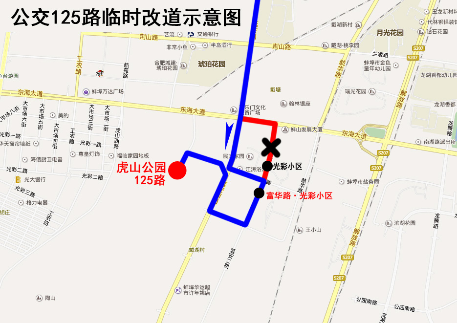125路公交车临时改道公告 因航华路(东海大道至康民路);富华路(东海大道至富民路)封闭施工,2019年4月17日起,公交125路大庆路桥首末站至虎山公园改道为:原线路—延安路—富民路—富华路—康明街—延安路—富民路—虎山公园首末站。虎山公园至大庆路桥首末站方向保持不变。 改道期间公交车将取消停靠“富华路•光彩小区(富民路北侧)”站。临时停靠“富华路•光彩小区(富民路南侧)”站。封闭施工结束后恢复原线。