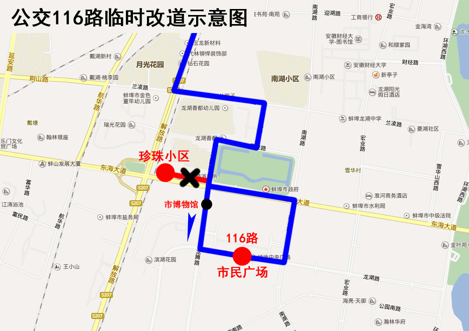 116路公交车临时改道公告 由于珍珠小区首末站门口道路封闭施工,2019年4月17日起,公交116路珍珠小区首末站迁至市博物馆南门市民广场处临时停靠。线路走向为:原线路—龙腾路—行湖路—南湖路—东海大道—龙腾路—原线路。 改道期间公交车将临时停靠“市博物馆”、“市民广场”站,封闭施工结束后恢复原线。