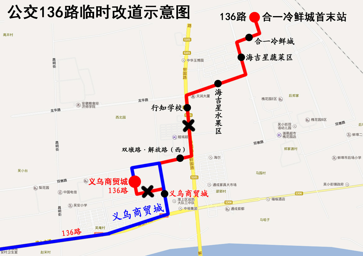 改道期间公交车将取消停靠“合一冷鲜城首末站”、“合一冷鲜城”、“海吉星蔬菜区”、“海吉星水果区”、“行知学校”、“双墩路•解放路(西)”站。封闭施工结束后恢复原线。