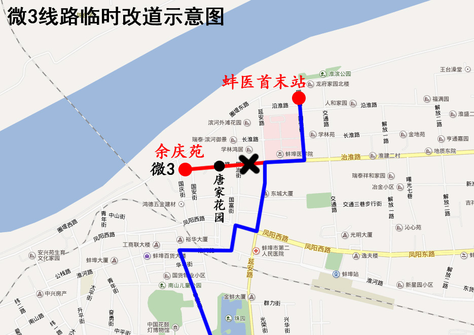 微3路公交车临时改道公告 因治淮路西段(国治街至延安路)封闭施工,2019年7月20日起,公交微3线路来回双向改道为:客运南站—原线路—延安路—治淮路—国强路—蚌医首末站。 改道期间公交车将取消停靠“唐家花园”、“余庆苑”站;临时停靠“蚌医首末站”站。封闭施工结束后恢复原线。