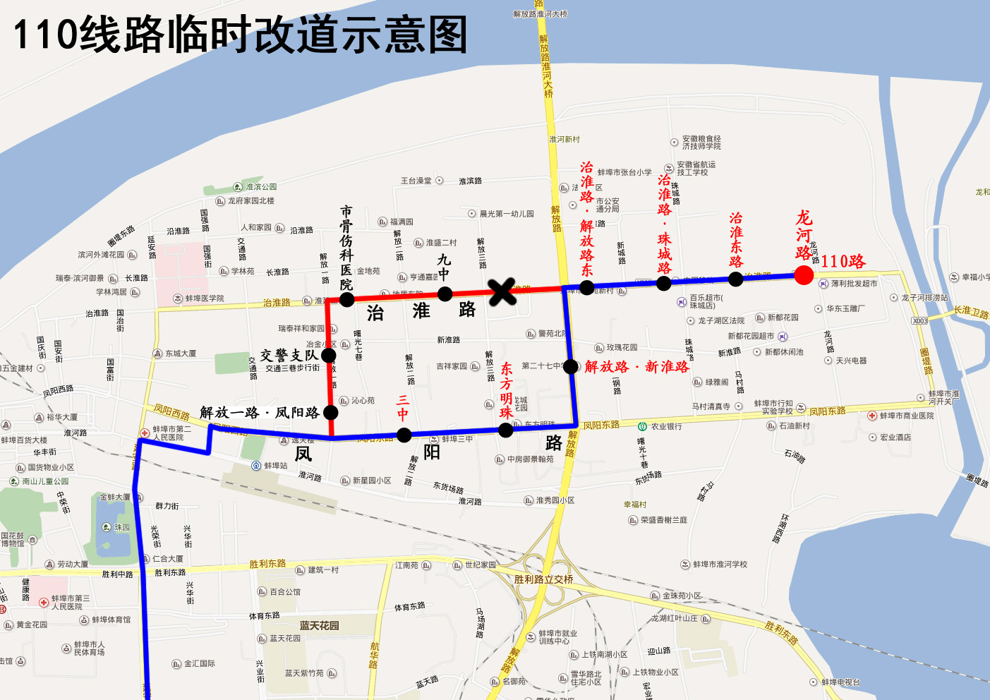 因治淮路(解放三路至解放路)封闭施工,2019年7月20日起,公交110路来回双向改道为:客运南站—原线路—凤阳路—解放路—治淮东路—龙河路。