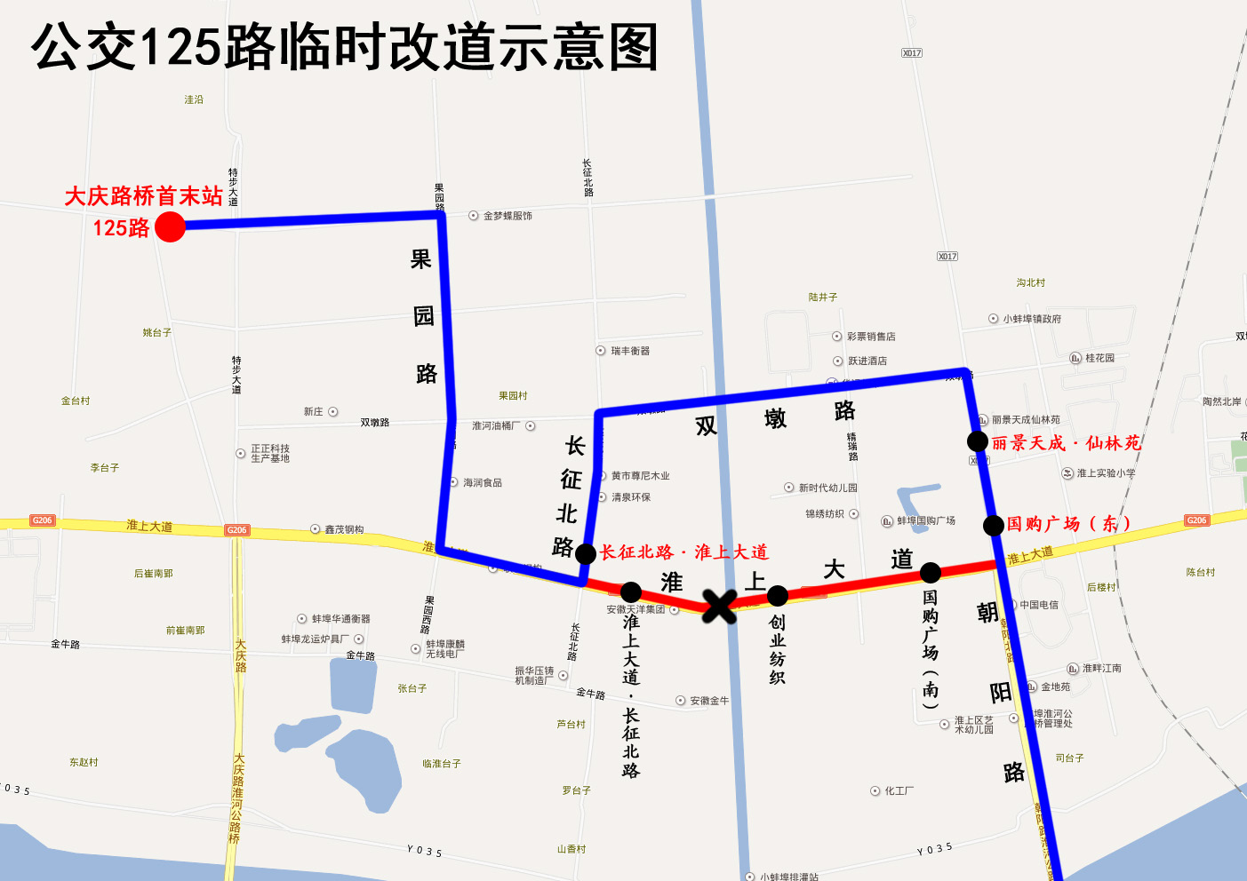 接上级通知,因淮上大道路面损坏严重,公交车无法通行。自2020年1月6日起,公交125路由:“原线路—淮上大道—朝阳路—原线路”调整为“原线路—淮上大道—长征北路—双墩路—朝阳路—原线路”。改道期间,公交车将取消停靠“淮上大道•长征北路”、“创业纺织”、“国购广场(南)”站。临时停靠“国购广场(东)”、“丽景天成•仙林苑”站。待路面满足公交车通行条件后将恢复原线。
