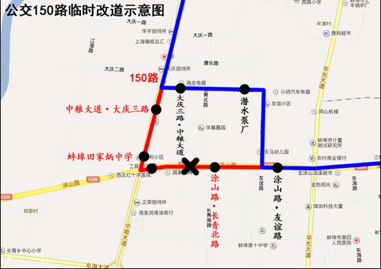改道期间,公交车将取消停靠“中粮大道•大庆三路”、“蚌埠田家炳中学”、“涂山路•长青北路”站。临时停靠“大庆三路•中粮大道”、“潜水泵厂(单边)”站。封闭施工结束后恢复原线。