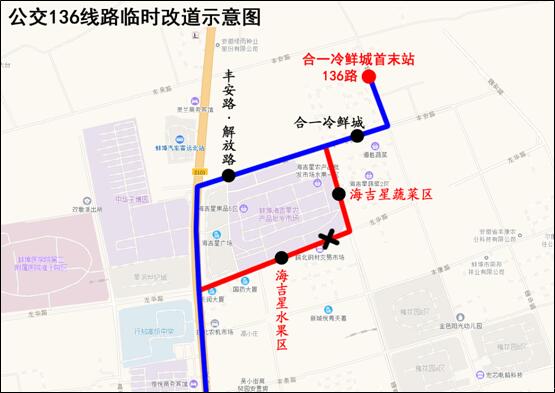 因盛世路道路拥堵、龙华路部分道路损坏严重,自2020年4月3日起,公交136路部分走向由:“合一冷鲜城首末站—丰安路—盛世路—龙华路—解放路—原线路”调整为“合一冷鲜城首末站—丰安路—解放路—原线路”。