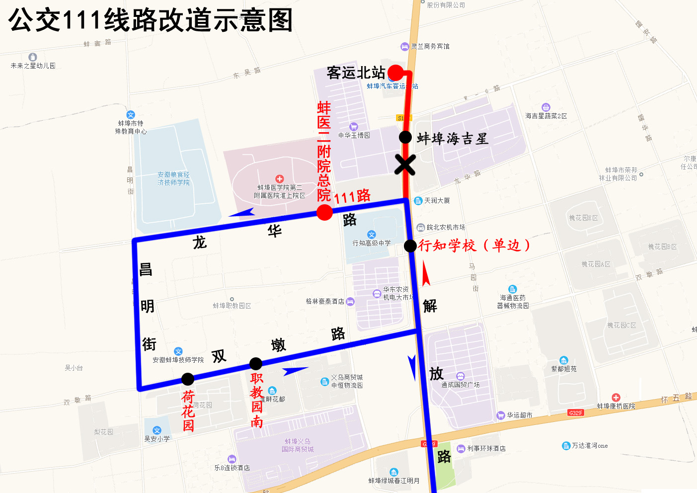 为方便市民去蚌医二附院总院就医及医护人员公交出行,自2020年4月16日起,调整公交111路部分走向。机电技师学院至客运北站方向调整为“机电技术学院—原线路—解放路—蚌医二附院总院”;客运北站至机电技师学院方向调整为“蚌医二附院总院—龙华路—昌明街—双墩路—解放路—原线路—机电技师学院”。 改道后,111路公交车将取消“蚌埠海吉星”、“行知学校(路西站)”停靠站;双墩路上增设“荷花园”、“职教园南”停靠站。
