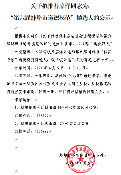 关于拟推荐廖洋同志为“第六届蚌埠市道德模范”候选人的公示