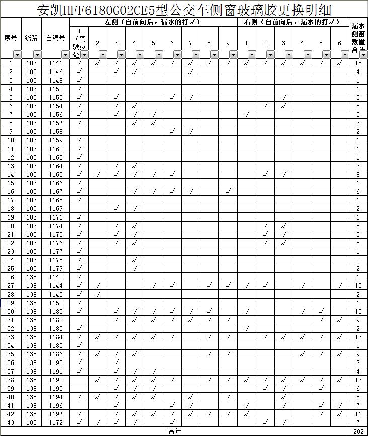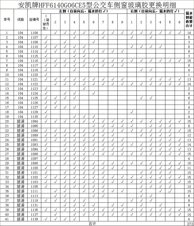 我公司正在使用的安凯牌HFF6140G06CE5及HFF6180G02CE5型公交车,现有部分车辆的侧窗出现渗、漏水现象,为了保障该批车辆的正常使用,拟对侧窗出现渗、漏水现象的玻璃胶更换服务进行公开招标,欢迎具备资格条件的国内潜在投标人参加投标。